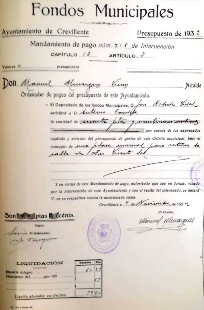 Per part seua, els crevillentins absents de Madrid van organitzar un acte homenatge a aquest compatriota, que va acceptar “a condició de desenvolupar-se en la més cordial intimitat”. El 4 de setembre va tindre lloc la recepció oficial al Fill Predilecte de la Vila per part de les autoritats i la banda de música per a procedir després al descobriment de la placa amb el seu nom al carrer Carmen, encarregada a Antonio Candela per un import de 60 pessetes i 25 cèntims.