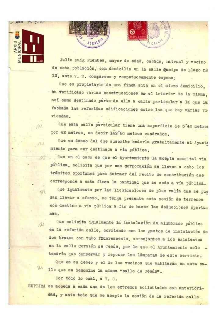 Hui es compleixen 60 anys de la denominació del carrer Jesús, gràcies a la sol·licitud plantejada per Julio Puig Fuentes, propietari i resident en el llavors carrer Queipo de Llanos, número 13