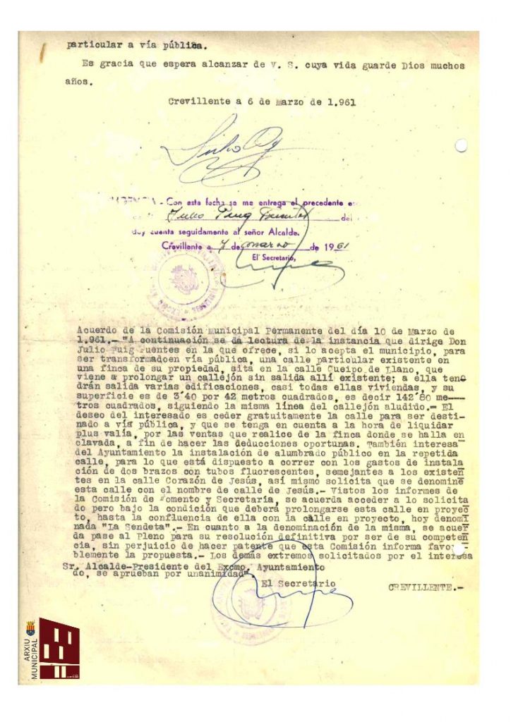 A canvi d’aquesta cessió, el sol·licitant només va imposar la condició que aquesta via, a petició de tots els veïns, passara a dir-se carrer de Jesús. Finalment, la Comissió Permanent va accedir al sol·licitat el 10 de març de 1961, sempre que aquesta es prolongara fins a la confluència del carrer en projecte, coneguda popularment com “La Sendeta”, que després es convertirà en Metge Mohammed Al-Shafra, insigne crevillentí de l’època medieval.