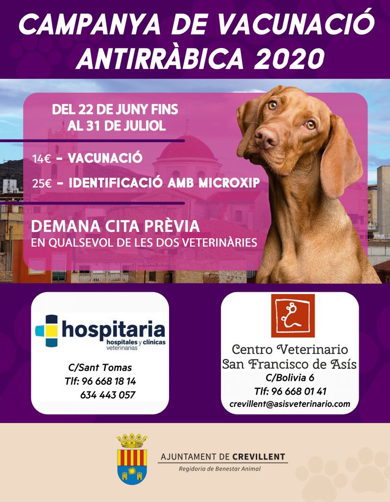 La campanya municipal per a la vacunació antiràbica i la identificació canina de Crevillent s’iniciarà dilluns que ve, 22 de juny, i s’estendrà fins al divendres 31 de juliol.