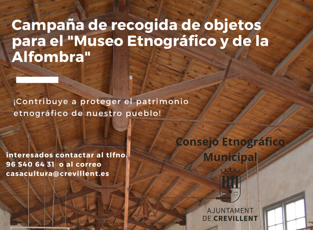 Con este audiovisual se pretende profundizar en la importancia de que todos podamos aportar esta serie de bienes que puedan formar parte de los fondos del futuro Museo Etnográfico y de la Alfombra y así impedir que se pierdan y no puedan ser disfrutados por el público general. Este audiovisual está disponible en el canal de youtube de Cultura Crevillent.