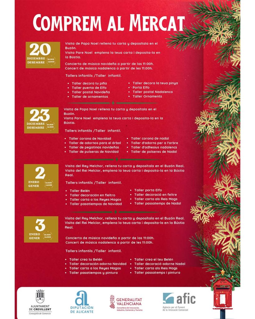 En concret, el divendres 20 de desembre el Pare Noel visitarà el Mercat d’Abastos per a rebre les cartes dels més xicotets. Eixe mateix matí, a partir de les 11.00 hores, tindrà lloc un concert de Nadal i es desenvoluparan tallers com a decoració de pinyes, creació de portes de elf, postals nadalenques i ornaments. El dimarts 23 de desembre, el Pare Noel tornarà al mercat per a continuar arreplegant cartes, acompanyat de tallers de corones de Nadal, adorns per a l’arbre, adhesius nadalencs i polseres.