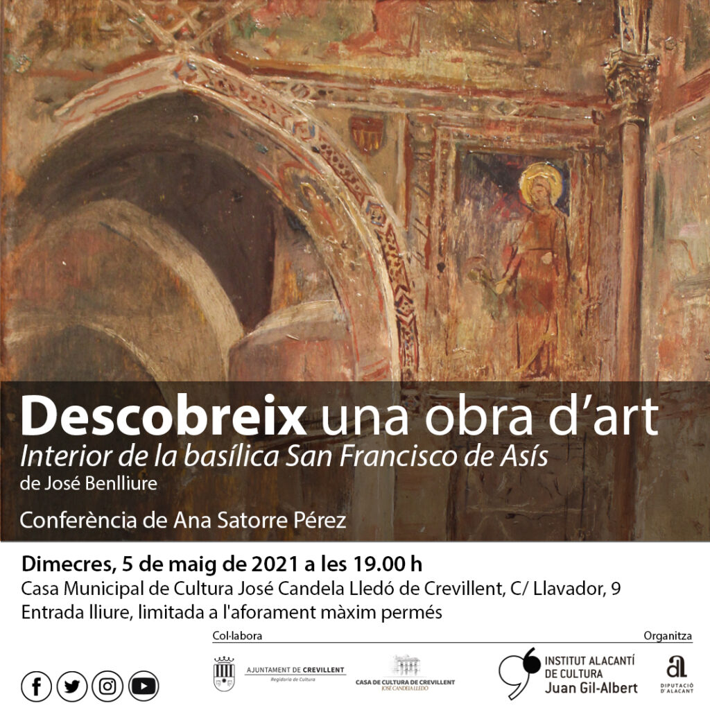 Serà Ana Satorre, Tècnica de Cultura de l’Ajuntament de Crevillent i estudiosa de l’obra de Marià Benlliure qui ens descobrirà l’obra seleccionada “Interior de la Basílica de San Fco. d’Assís”, una de les obres que es custodien en el Museu Monogràfic Municipal de Marià Benlliure de Crevillent, pertanyent a l’època de l’esplendor de l’artista i que resumix part de la seua trajectòria artística.