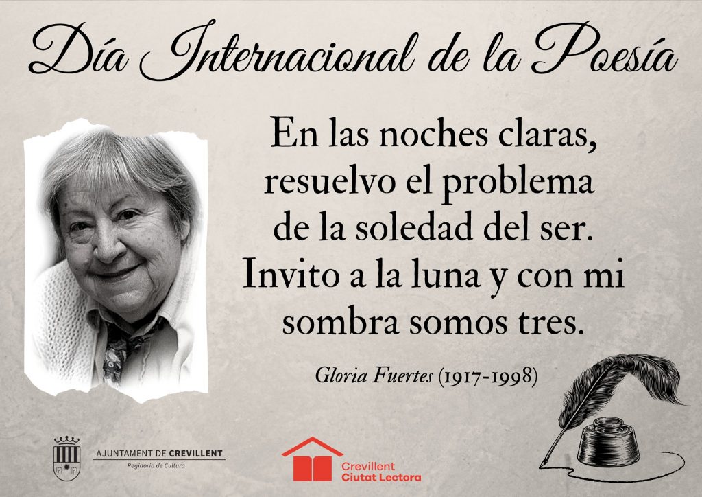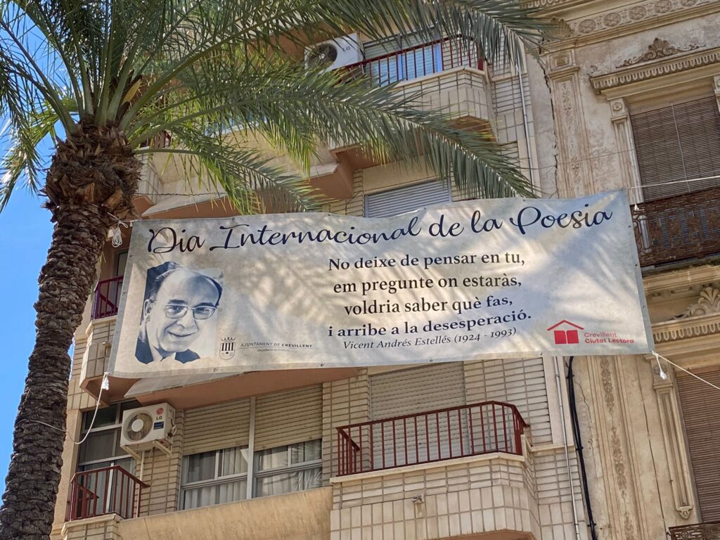 El Ayuntamiento de Crevillent se ha sumado a la celebración del Día Mundial de la Poesía (21 de marzo), declarado por la UNESCO en 1999. Este año la Biblioteca Municipal ha realizado una selección de poemas, a través de lonas, que se han colgado en las calles y edificios municipales para acercar a la ciudadanía este género literario.
