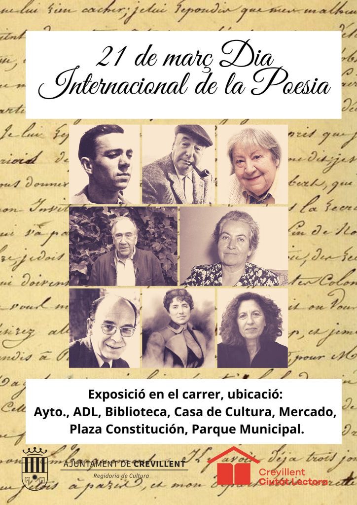 L’Ajuntament de Crevillent s’ha sumat a la celebració del Dia Mundial de la Poesia (21 de març), declarat per la UNESCO en 1999. Enguany la Biblioteca Municipal ha realitzat una selecció de poemes, a través de lones, que s’han penjat als carrers i edificis municipals per a acostar a la ciutadania aquest gènere literari.