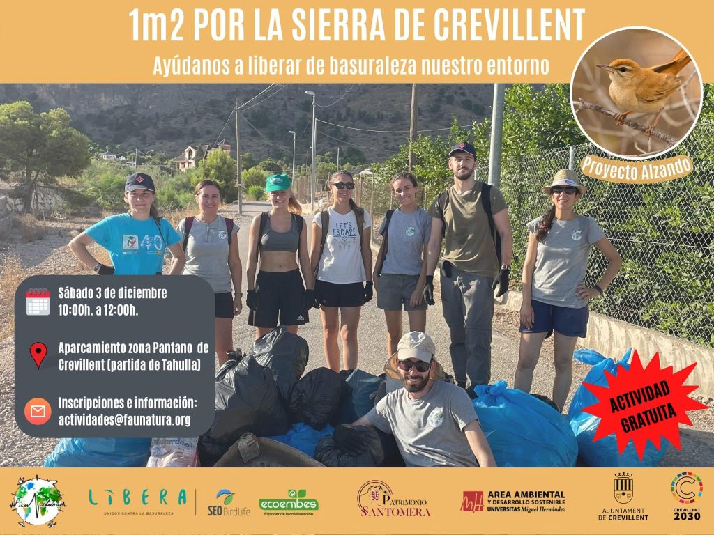 Crevillent – L’Ajuntament de Crevillent, juntament amb l’Associació Faunatura, es van adherir al Projecte LIBERA “con mi pueblo sin basuraleza”, el mes d’agost passat. Arran d’eixe compromís s’ha llançat una campanya de recollida de residus anomenada “1m2 pel camp, els boscos i les muntanyes, que es realitzarà del 3 a l’11 de desembre (coincidint amb el Dia Internacional de les Muntanyes).