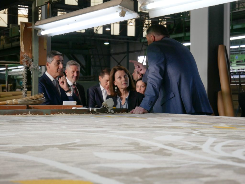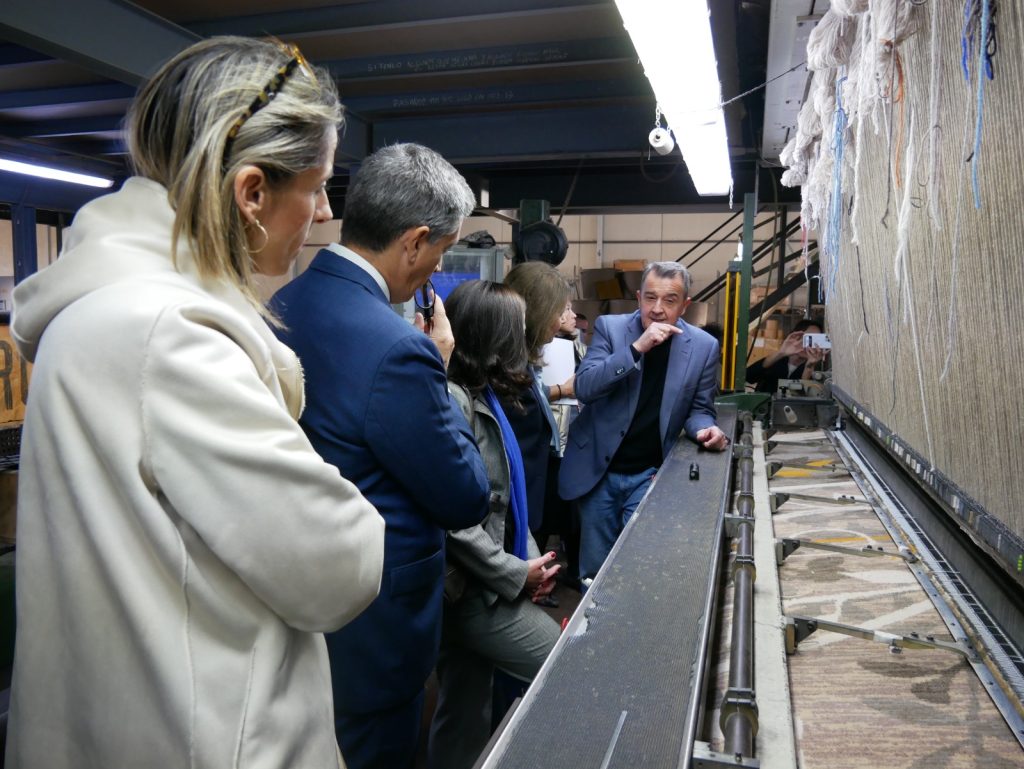 La ruta previa a la entrega de la documentación del expediente de la solicitud de IGP se inició con la visita a la Cueva Museo del Esparto, ubicado en el IES Macià Abela, con las exhibiciones del taller de esparto de l’Associació d’Amics de l’Espart “Antonio i Matilde”. Tras ello, la delegación se desplazó a Antonio Pérez Adsuar S.A. – Alfombras y Moquetas Imperial, empresa centenaria, muy especializada en la fabricación de moqueta Axminster (80% lana y 20% nylon) para hoteles de cinco estrellas y de lujo, aunque también dispone de una línea de producción de telares Wilton (100% lana). Según datos de UNIFAM, el 70% de su producción de esta empresa lo destinan a la exportación y venden sus productos en los cinco continentes. A través de esta empresa, cuya dirección ya está en manos de la cuarta generación y la quinta ya está realizando sus primeras incursiones, pudieron conocer el proceso de fabricación de una alfombra. La delegación pudo también ver cómo funciona el nuevo equipo productivo tras la inversión de 1,3 millones de euros para un nuevo telar de grandes dimensiones. Dicha inversión ha contado con el apoyo de la Conselleria de Innovación, Industria, Comercio y Turismo a partir de fondos europeos con un montante de 200.000 euros.