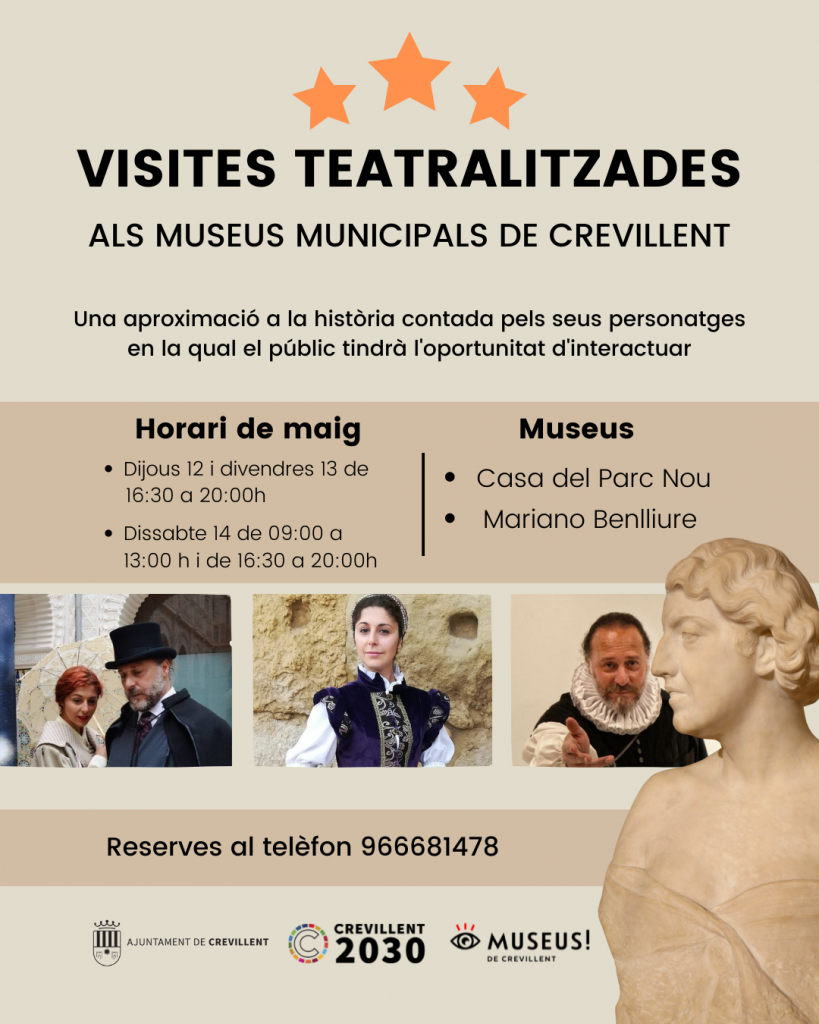 Crevillent – Las visitas teatralizadas son una forma muy interesante de acercarse a la historia donde las y los participantes viven en primera persona los acontecimientos históricos descritos e interactúan con los actores, resultando una experiencia mucho más amena y atractiva. Este es el nuevo formato elegido por la Concejalía de Cultura y los Museos de Crevillent para dar a conocer de una forma diferente los museos municipales Mariano Benlliure y la Casa-Museo del Parc Nou, donde se encuentra ubicado también el Museo Arqueológico Municipal.