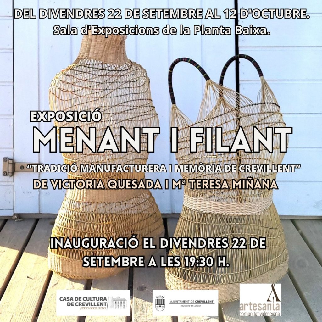 Crevillent – L’exposició “Menant i Filant. Tradició manufacturera i memòria de Crevillent” es podrà visitar des del divendres 22 de setembre fins al dijous 12 d’octubre a la Casa de Cultura “José Candela Lledó”. L’exposició mostra treballs de l’artista Victoria Quesada, llicenciada en Belles Arts, i de María Teresa Miñana, artesana d’àmplia trajectoria que treballa la cistelleria d’espart, i que ha obtingut en diverses ocasions el “Premi Artesania de la Comunitat Valenciana”, reconegut per la Generalitat Valenciana.