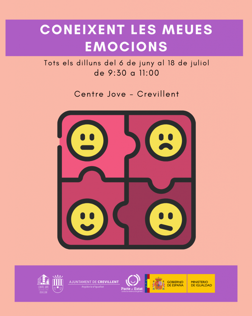El taller “Coneixent les meues emocions” serà un espai on es podran conéixer les pròpies emocions, el seu significat i com gestionar-les davant de les situacions de la vida quotidiana.