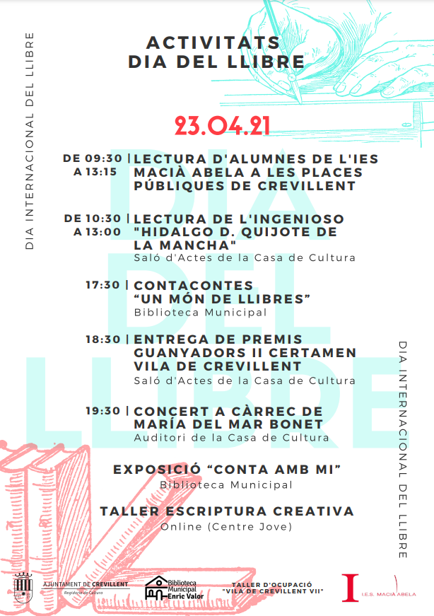 Des de la Regidoria de Joventut, que dirigeix la regidora Ana Vanesa Mas, s’ha organitzat un Taller d’Escriptura Creativa, que es realitzarà des del Centre Jove de manera “online” per la situació de pandèmia. Ha sigut promogut pels alumnes del Taller d’Ocupació Vila de Crevillent VII. Mentre que des de la Regidoria de Festes es participarà també en aquesta celebració dins de la programació de Poble Primavera, organitzat per la regidoria de Josep Candela, amb el concert de la cantautora mallorquina Mª de la Mar Bonet, que s’iniciarà a les 19.30 a l’Auditori de la Casa de Cultura i per al qual cal retirar invitació per internet. El regidor de Cultura, Jesús Ruiz, ha destacat que totes aquestes activitats per a la celebració del Dia de Llibre, en col·laboració amb diferents regidories i entitats locals, s’emmarquen en el desenvolupament del projecte de Crevillent, Ciutat Lectora, un projecte col·lectiu d’impuls a la lectura i de coordinació de totes les activitats que puguen millorar els nostres hàbits lectors en qualsevol etapa de la nostra vida.