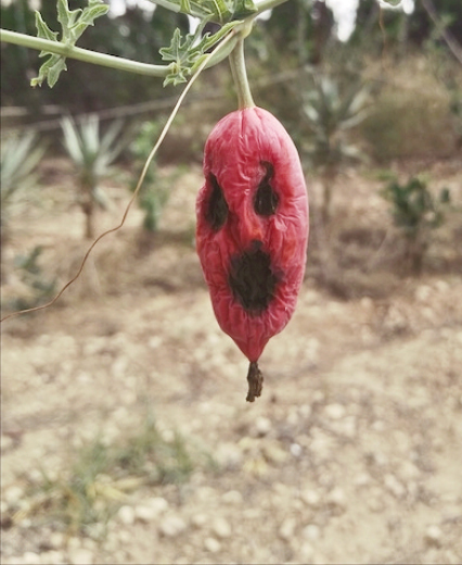 Uno trata de cultivar en su pequeño huerto y jardín plantas ornamentales que no son nada usuales por estos lares. La mayoría de ellas son suculentas subtropicales (no necesariamente cáctus) y caudiciformes, es decir, que almacenan agua y nutrientes en un cáudice o tronco engrosado a tal efecto. Ejemplos de ello serían los populares dondiego de noche o las beaucarneas, llamadas también patas de elefante. Pues bien, el otro día cuando paseaba junto a una zona donde tengo plantadas algunas de ellas con riego por goteo… ¡No podía creer lo que estaba viendo! ¡El mismísimo Lucifer me miraba desafiante disfrazado bajo la apariencia del fruto ya pasado de una enredadera sudafricana pariente de las calabazas y los melones llamada Coccinia rehmanii! o tal vez sea un adelanto de Halloween.