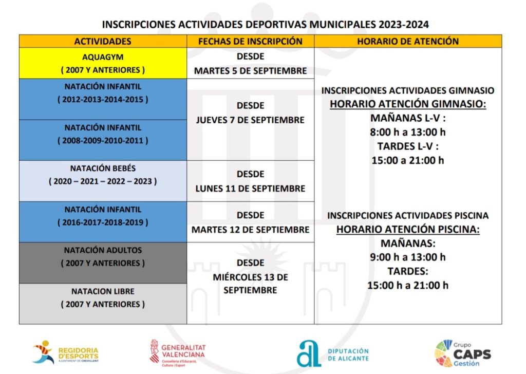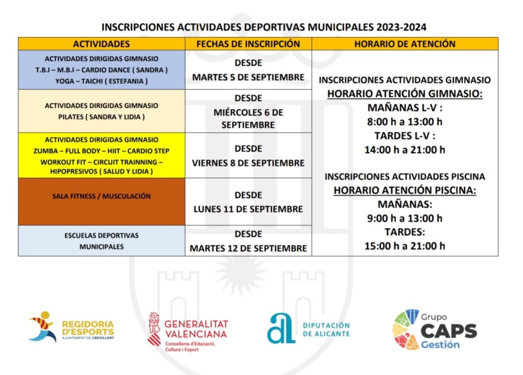 Crevillent – La Regidoria d’Esports anuncia que l’obertura d’inscripcions per a les Activitats Esportives Municipals 2023-2024 s’obrirà el pròxim 5 de setembre. Tots els interessats i interessades hauran d’inscriure’s de manera presencial o bé en les instal·lacions del Gimnàs Municipal o bé en la Piscina Municipal, depenent de l’activitat a la qual es vulga inscriure.