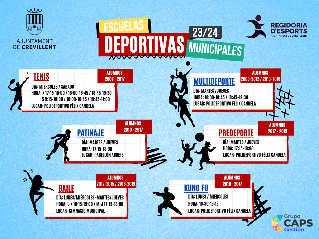 I, finalment, en l’apartat d’activitats de les Escoles Esportives estan contemplades pre-esport, multiesport, ball infantil, patinatge, kung fu i tennis. Es tracta d’un conjunt d’activitats per a xiquets i xiquetes.