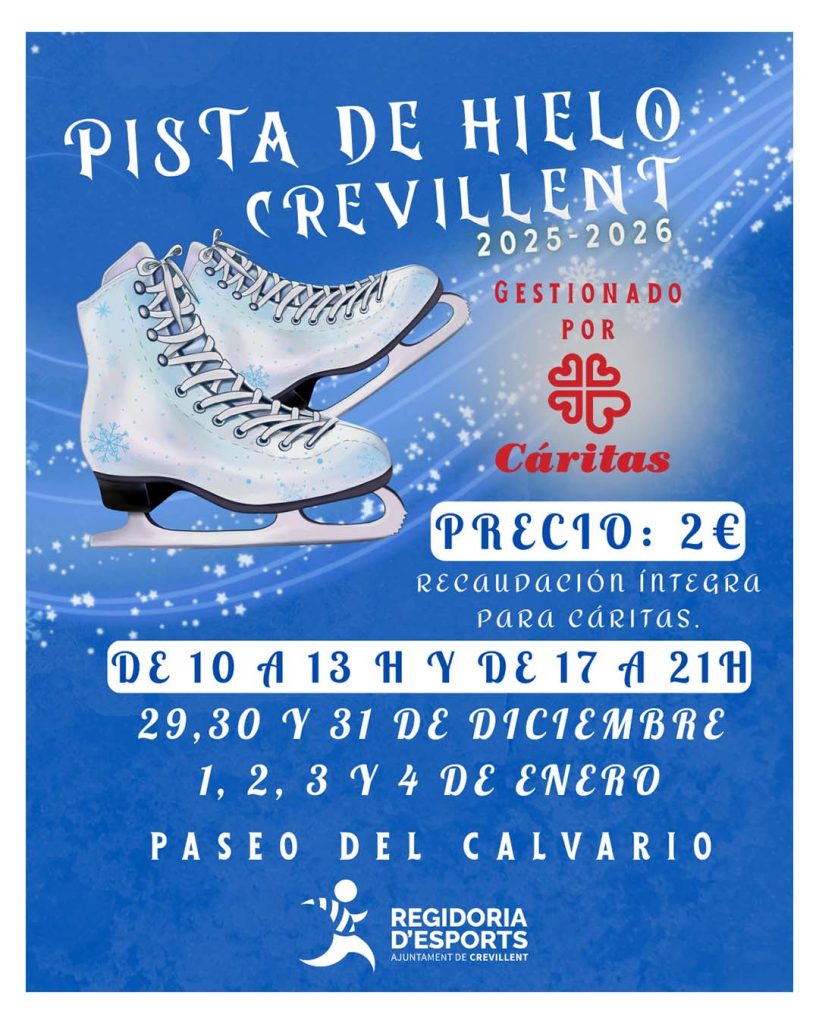 - La pista de hielo se podrá disfrutar entre el 29 de diciembre al 4 de enero con fines solidarios y pensadas para el público familiar, al tiempo que durante la mañana del 4 de enero habrá una pedalada de Reyes, con la colaboración de la Policía de Crevillent que también instalará un pequeño parque de tráfico
