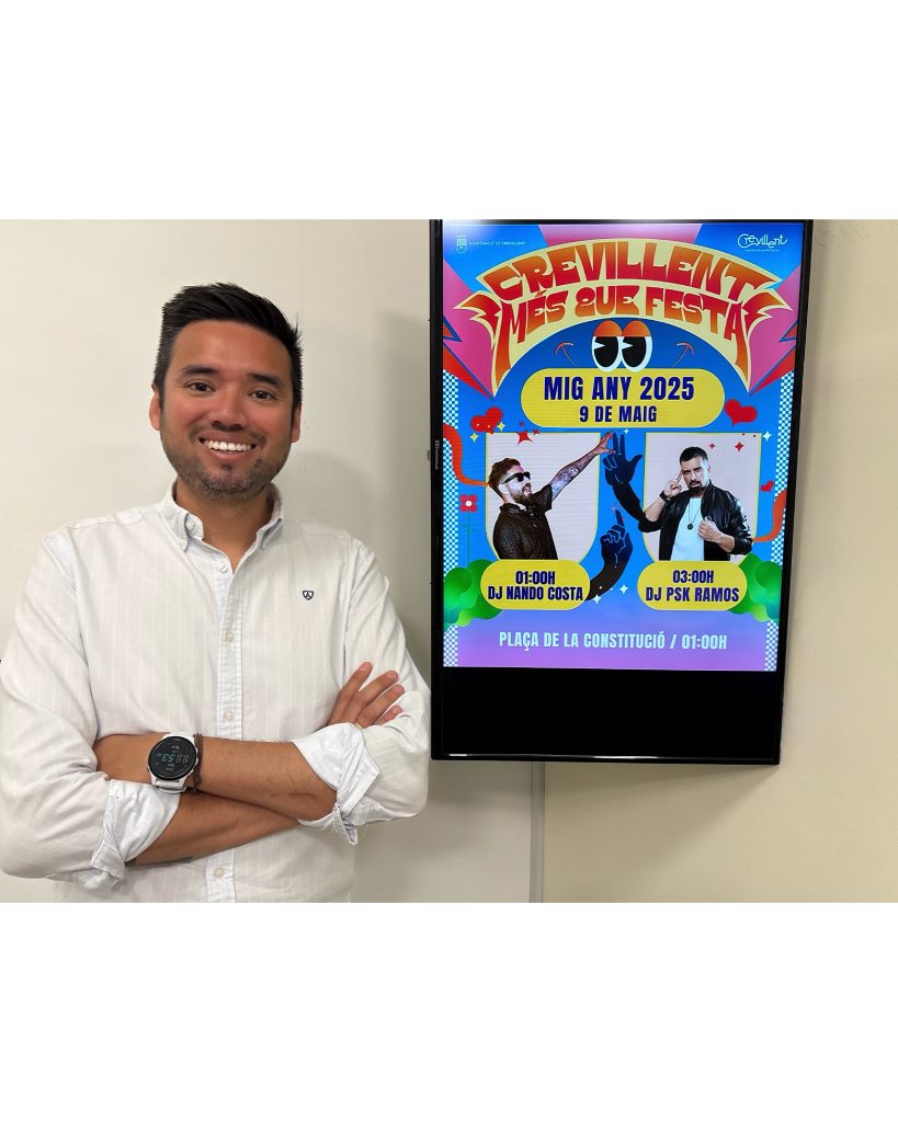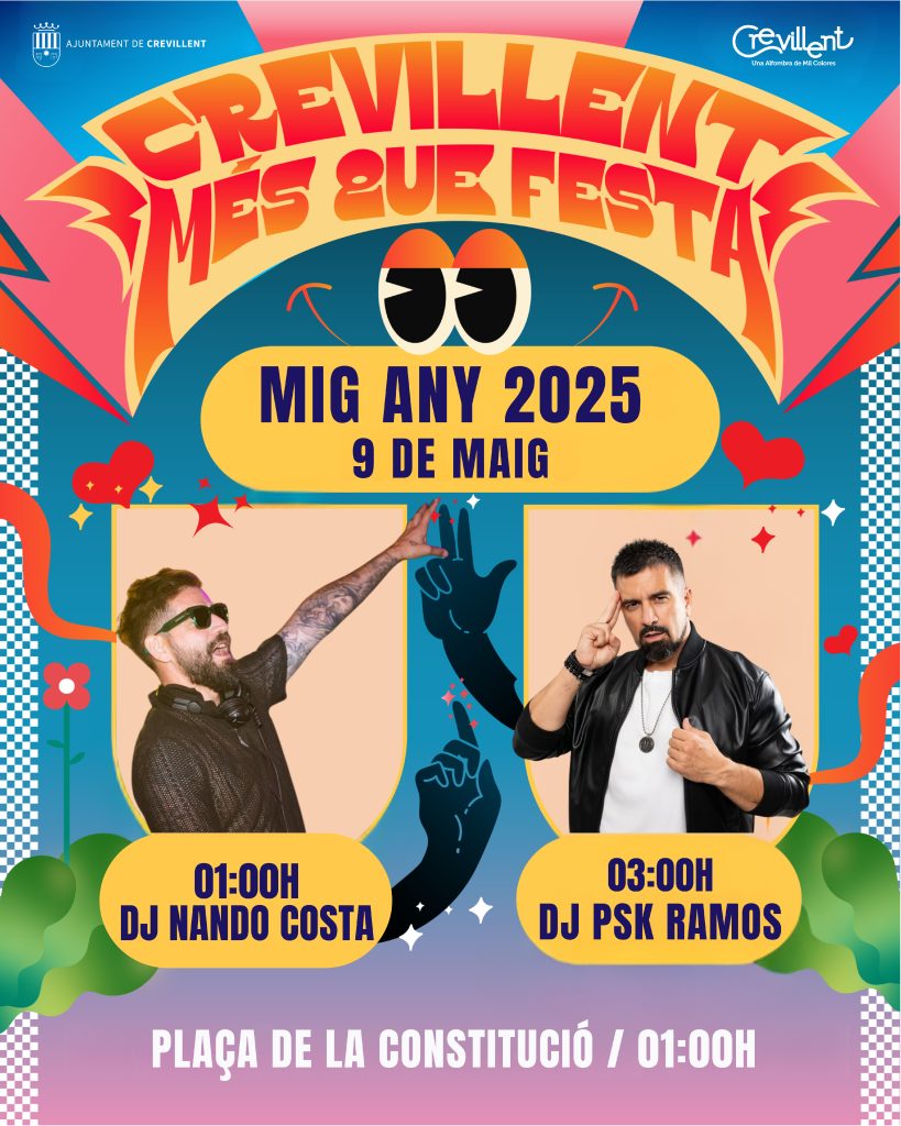 Crevillent – El concejal de Ocio, Pedro García Magro, ha presentado este viernes el cartel de la fiesta que tendrá lugar el próximo viernes 9 de mayo con motivo de “Mig Any 2025” en la Plaza de la Constitución a partir de las 01:00 horas. “Es una noche de las más esperadas por los los crevillentinos y crevillentinas porque indica que nos queda medio año para recibir a nuestra fiesta de Moros y Cristianos en nuestra localidad”, ha indicado el edil García Magro, al tiempo que ha anunciado que “hemos apostado por una noche de fiesta con variedad de estilos musicales para contentar al máximo público posible”.