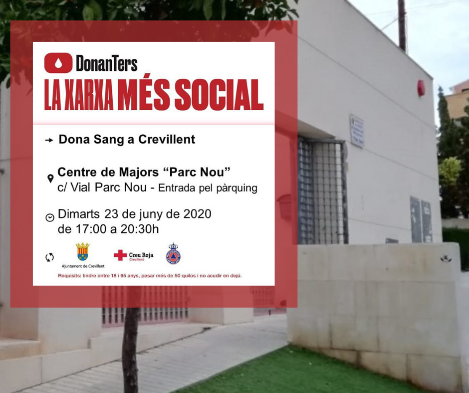El Centre de Transfusió de la Comunitat Valenciana i l’Ajuntament de Crevillent informen que demà, 23 de juny, hi haurà col·lecta de sang al Centre de Majors Parc Nou situat al carrer Vial Parc Nou de la localitat. La donació començarà a les 17.00 hores i finalitzarà a les 20.30 hores. Des de la Regidoria de Sanitat agraeixen la solidaritat dels veïns i veïnes de Crevillent i animen a continuar participant en aquestes donacions, ja que la sang no es fabrica i es necessita per a operacions quirúrgiques, parts, persones amb leucèmia i altres tipus de càncer, i per a atendre víctimes d’accidents de trànsit, entre altres.