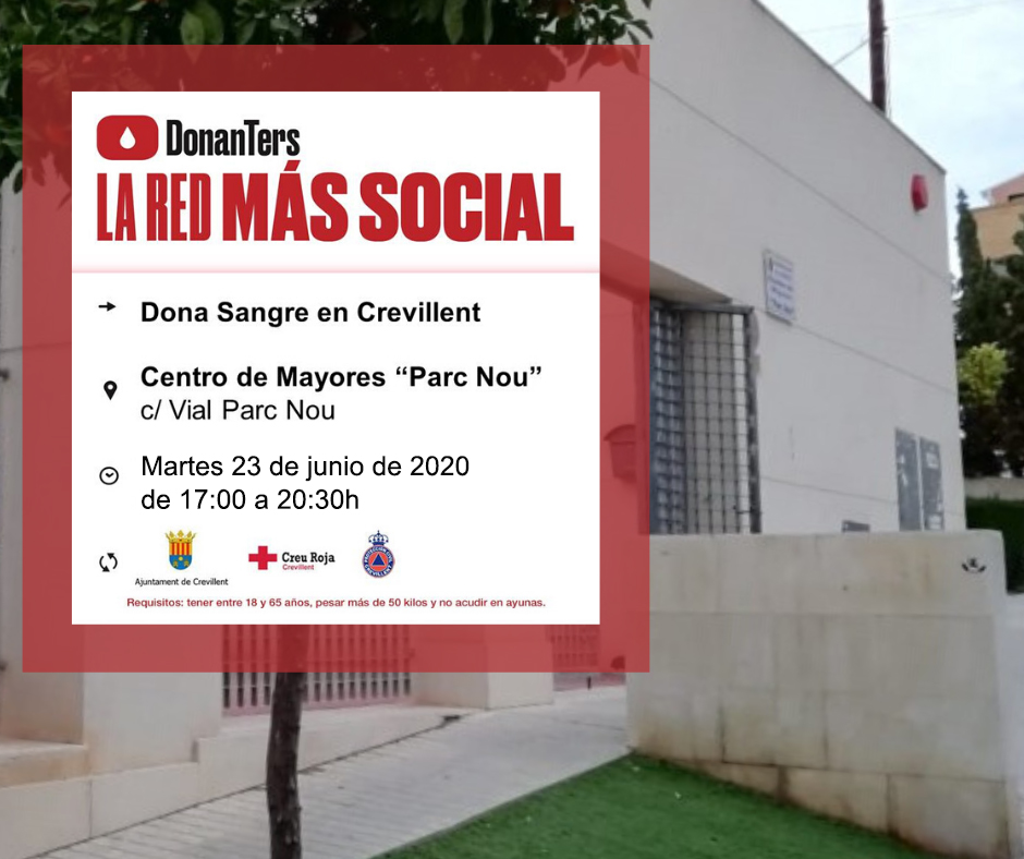 El Centro de Transfusión de la Comunidad Valenciana y el Ayuntamiento de Crevillent informan que mañana, 23 de junio, habrá colecta de sangre en el Centro de Mayores “Parc Nou” situado en C/ Vial Parc Nou de la localidad. La donación comenzará a las 17:00 horas y finalizará a las 20:30 horas.