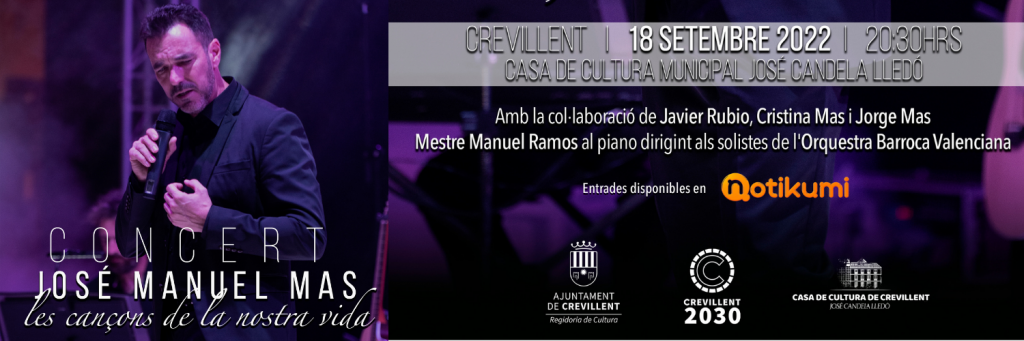 Crevillent – La Concejalía de Cultura del Ayuntamiento de Crevillent se enorgullecen de traer de vuelta al cantante crevillentino más cotizado a nivel nacional, tanto por su amplio registro como por su seguridad vocal, José Manuel Mas. El concierto tendrá lugar el próximo día 18 de septiembre a las 20:30h en el auditorio de la Casa Municipal de Cultura “José Candela Lledó”. En esta ocasión el artista local contara con la colaboración de Javier Rubio, su hija Cristina Mas, y al piano dirigiendo a las solistas de la Orquesta Barroca Valenciana, el maestro Manuel Ramos.
