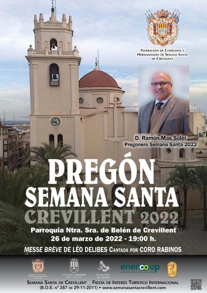 La Federación de Cofradías y Hermandades ha hecho público la reelección del nombramiento de Ramón Mas Soler, como Pregonero de la Semana Santa 2022, cargo para el que fuera elegido en diciembre de 2019 y que la situación pandémica de la COVID-19 impediría por seguridad sanitaria.