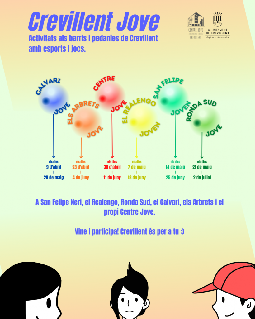 L’horari d’aquestes jornades serà de 9:15 a 10:45 h. Les dates de “Crevillent Jove” als barris i pedanies són: