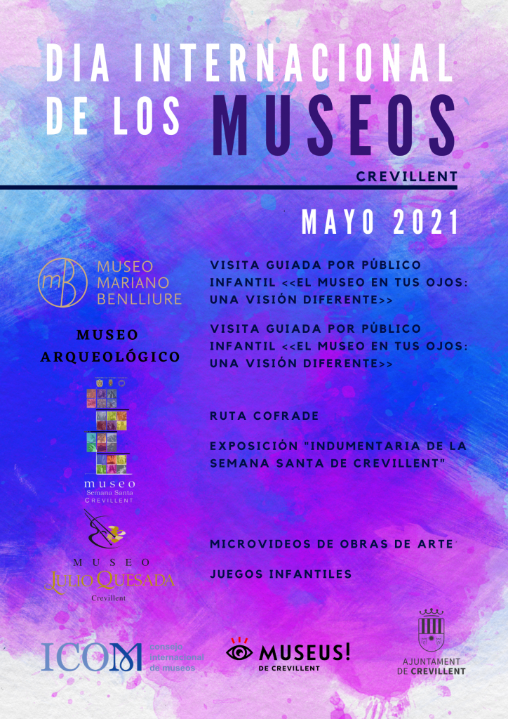 En la recent reunió del Consell Municipal “Museus de Crevillent” es va acordar celebrar una sèrie d’activitats per a la celebració del Dia Internacional dels Museus (DIM), que el Consell Internacional de Museus va determinar que siga el 18 de maig. Malgrat l’actual situació de pandèmia i donades les perspectives de millora que es venen donant en l’evolució d’aquesta, es va veure necessari i factible la realització de determinades activitats per a la promoció dels nostres Museus.