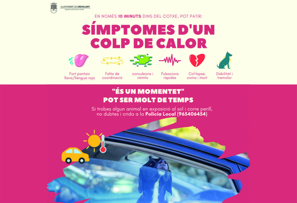 La Concejalía de Bienestar Animal de Crevillent ha puesto en marcha la campaña “És un momentet pot ser molt de temps” para concienciar sobre los graves peligros que conlleva dejar a las mascotas en verano al sol, en el interior de los vehículos, o en otros espacios donde tengan que estar mucho tiempo soportando altas temperaturas: terrazas, balcones…
