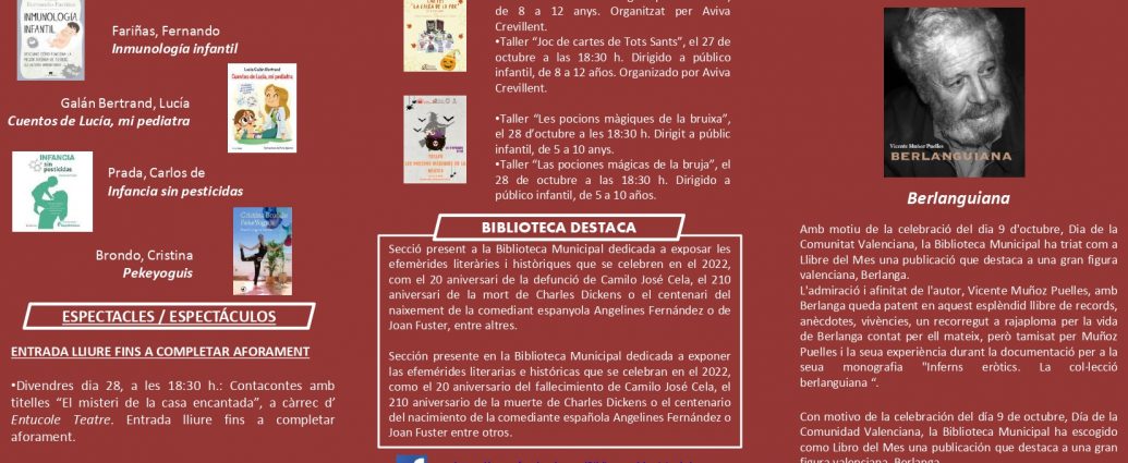 El document núm. 139 conté esdeveniments com un taller sensorial per a bebés que es durà a terme en el Parc Nou, un contacontes per a xiquets de 7 a 12 anys i un taller de robòtica, entre altres activitats