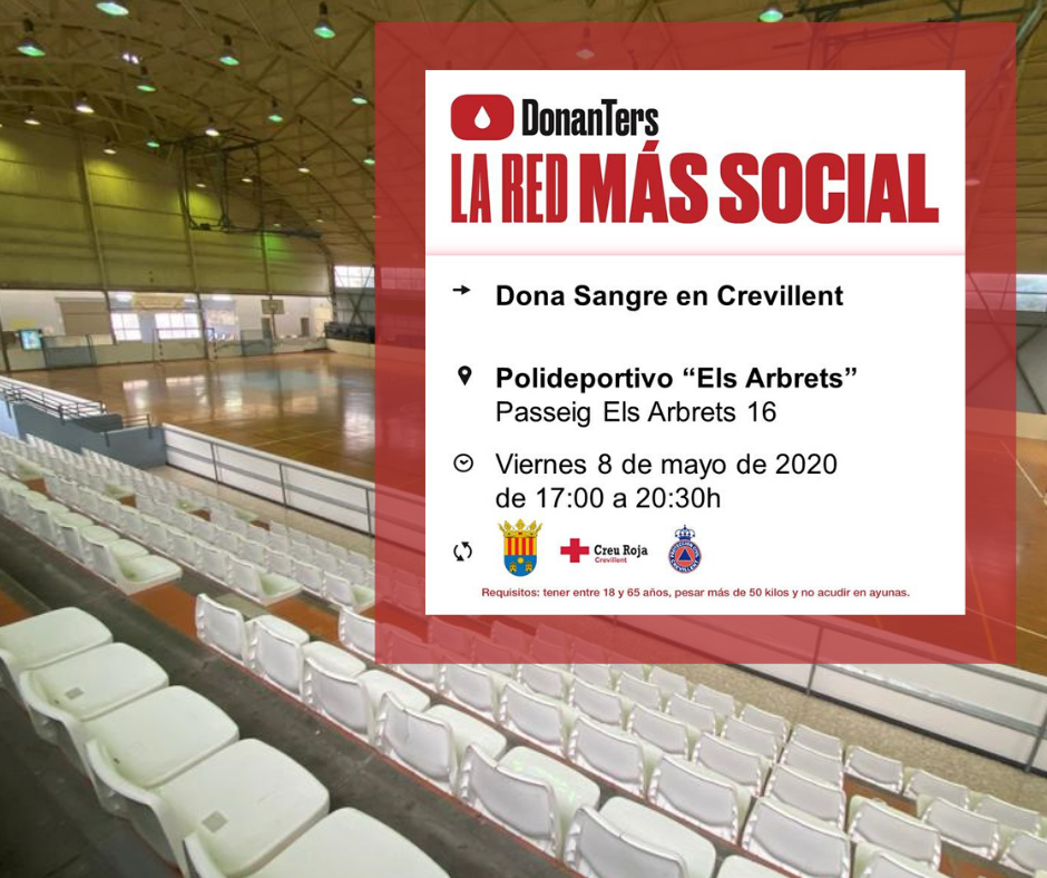La colecta de sangre se desarrollará mañana, 28 de abril, de 18’00 a 20’30 horas en el Pabellón “Els Arbrets” con medidas de seguridad y prevención extraordinarias