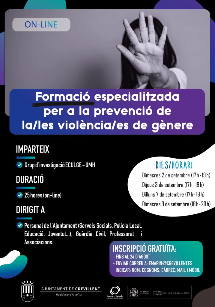 Detectar, previndre i erradicar la violència de gènere és l’objectiu de la formació online que oferirà la Regidoria d’Igualtat de Crevillent durant el mes de setembre, concretament els dies 2,3,7 i 9 setembre.
