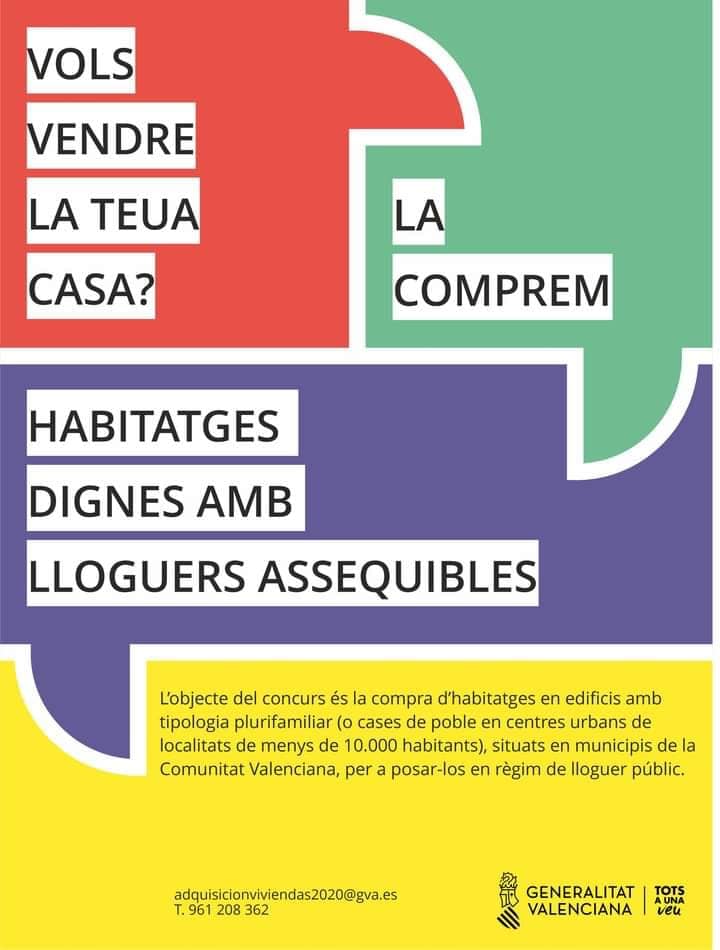Des de la Regidoria d’Habitatge comenten que aquesta és una bona oportunitat per a totes aquelles persones que necessiten vendre els seus immobles per a poder solucionar problemes com una execució hipotecària, enfrontar-se a un divorci, repartir una herència… Ja que, a més de solucionar el seu problema, ajuden al fet que aquests habitatges queden en mans de la Generalitat i puguen posar-se en lloguer a preus accessibles, incrementant el Parc Públic d’Habitatge en la nostra localitat.
