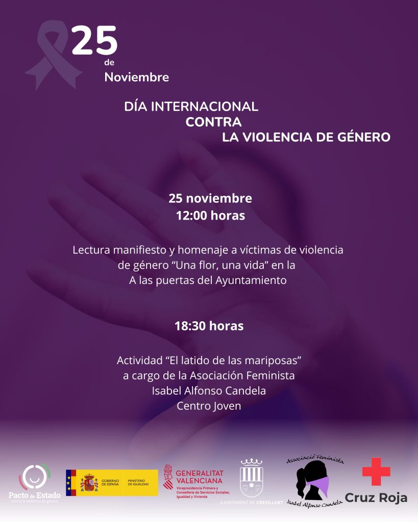 Crevillent – La Regidoria d’Igualtat ha presentat la programació amb motiu del 25 de novembre, Dia Internacional per a l’Eliminació de la Violència contra la Dona. Una completa agenda d’activitats que es desenrotllarà al llarg de diverses jornades i que ha sigut organitzada conjuntament per l’àrea municipal i l’Associació Feminista “Isabel Candela Alfonso”.