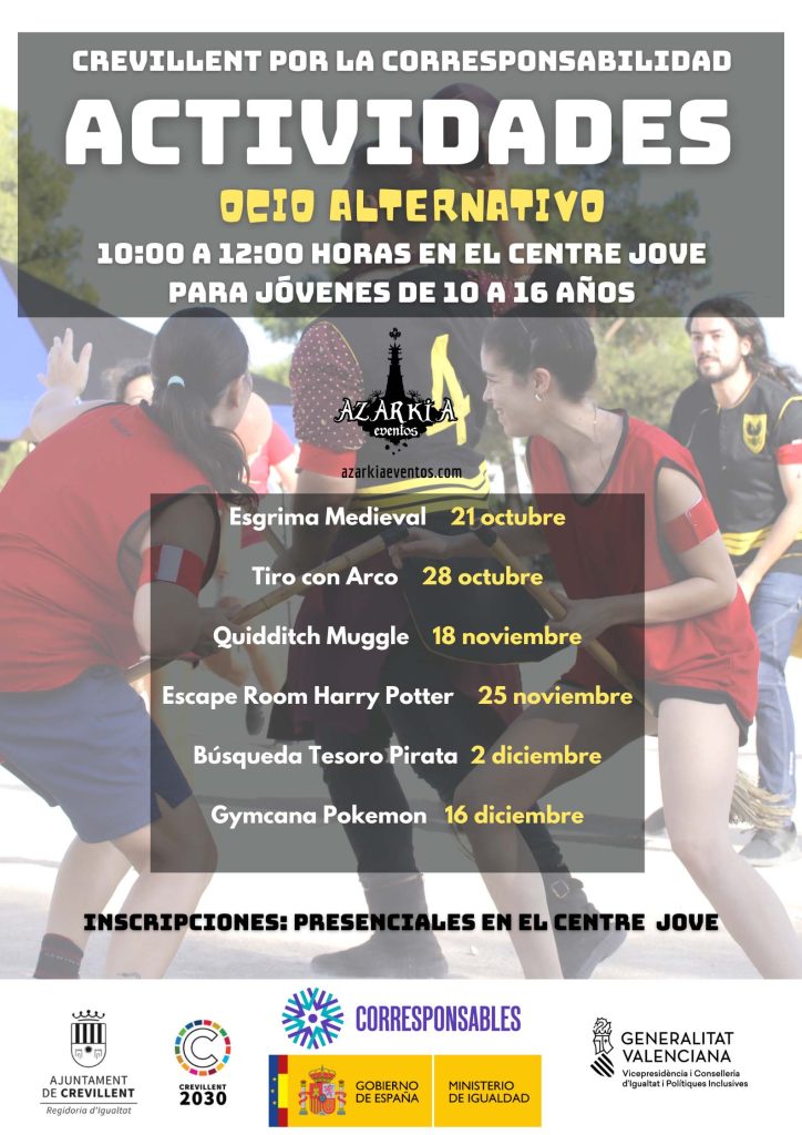Finalment, Igualtat també ha programat l’activitat “Oci Alternatiu”, dedicada també a joves de 10 a 16 anys i que s’impartirà, en horari de 10.00 a 12.00 hores, durant els següents dies: el 21 d’octubre tindrem Esgrima Medieval, el 28 d’octubre gaudirem de Tir amb Arc, el 18 de novembre hi haurà Quidditch Muggle, el 25 de novembre s’ha planificat l’activitat Escape Room Harry Potter, el 2 de desembre tindrem Cerca Tesoro Pirata i el 16 de desembre s’ha programat la Gymcana Pokemon. S’han habilitat 20 places per a aquest conjunt d’activitats contemplades en “Oci Alternatiu”.