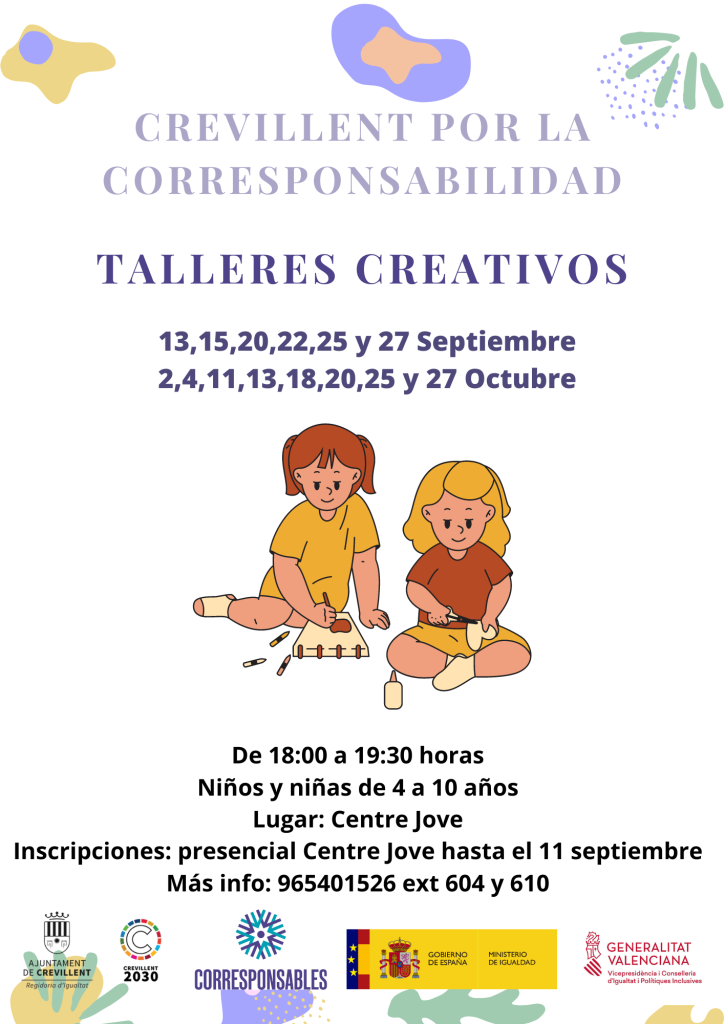 Por un lado, la concejala de Igualdad, Pilar Mas Mas, ha anunciado la apertura de inscripción para la actividad “Talleres Creativos” para niños y niñas de 4 a 10 años. Talleres Creativos” se desarrollará los días 13, 15, 20, 22, 25 y 27 de septiembre y los días 2, 4, 11, 13, 18, 20, 25 y 27 de octubre, en horario de 18:00 a 19:30 horas. Se han habilitado un total de 35 plazas para este taller. Para más información, se puede llamar al teléfono 965 40 15 26 en las extensiones 604 y 610.