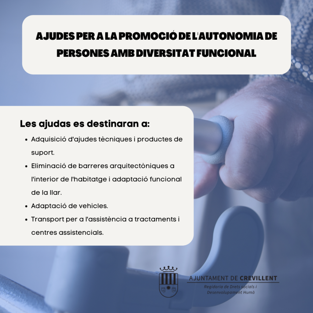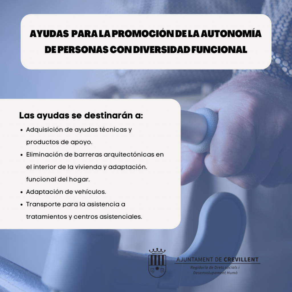Crevillent – La Concejalía de Derechos Sociales y Desarrollo Humano informa que está abierto el plazo para solicitar las “Ayudas personales de promoción de la autonomía personal para personas con diversidad funcional”, para el ejercicio 2022, de la Conselleria de Igualdad y Políticas Inclusivas.