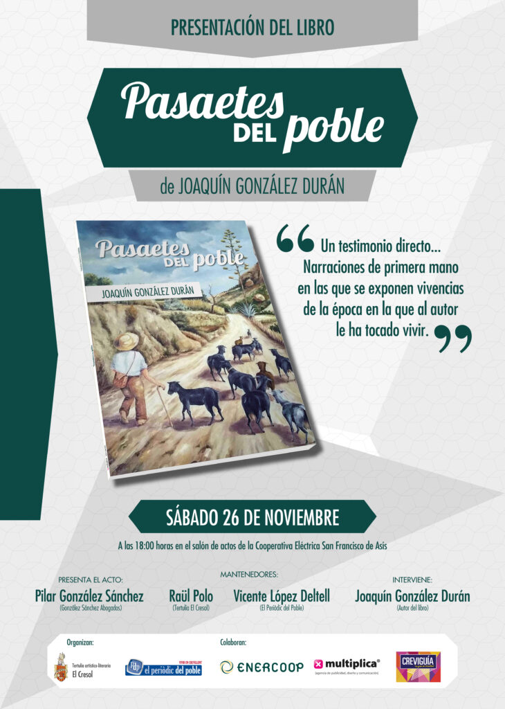 El próximo sábado 26 de Noviembre en los salones de la Cooperativa Eléctrica Benéfica San Francisco de Asís (Enercoop) de Crevillent, a las 18:00 horas, se presenta «Pasaetes del Poble», un libro recopilatorio de los escritos firmados por el miembro de la Tertulia El Cresol Joaquín González Durán para El Periòdic del Poble, así como una selección de sus publicaciones para Harmonía.