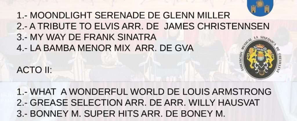 La A. M. La Sinfónica de Crevillent, ofrece a cargo de la Sinfónica Big Band, un concierto, auspiciado por a Concejalia de Cultura del Ayuntamiento de Crevillent, y con motivo de Santa Cecilia, concierto basado en temas inolvidables del recuerdo, interpretando a Frank Sinatra, Louis Armstrong, Glenn Miller, Nino Bravo y otros muchos autores y grupos que hicieron una época.