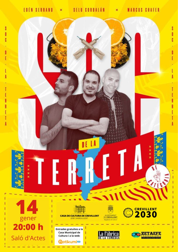 Crevillent – El dissabte, 14 de gener, a les 20.00 h. en la Sala d’actes de la Casa Municipal de Cultura “José Candela Lledó”, tindrà lloc l’espectacle “Soc de la Terreta”. El xou ve de la mà de la companyia “Zetaefe produccions”, i s’emmarca dins de la XI Mostra de Teatre organitzada per la Regidoria de Cultura de l’Ajuntament de Crevillent i subvencionada per la Diputació Provincial d’Alacant.