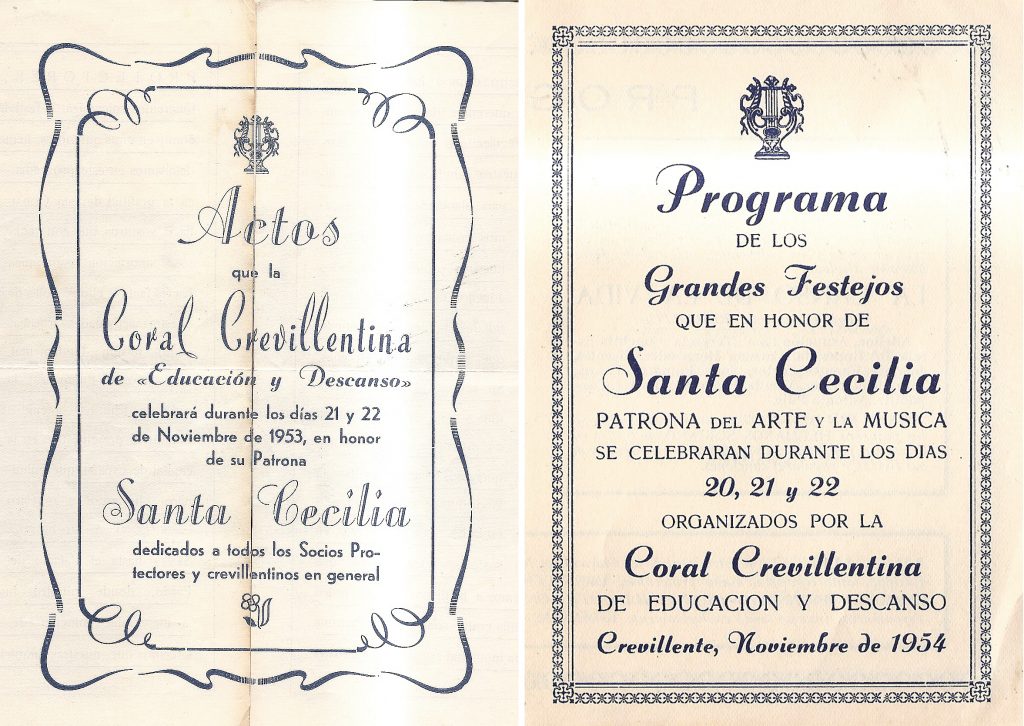Tras la Guerra Civil, la música vuelve a ser el alma de la población; el crevillentino vibra con su coral o su banda en cada acontecimiento. Giras nacionales (1955 Zaragoza, Valencia, Barcelona, Madrid), primeros premios en concursos, grabación de discos; hasta llegar la culminación con las temporada de óperas de Elda y la toma de contacto con las figuras más importantes del panorama nacional, Montserrat Caballé, Plácido Domingo, Juan Pons, Carreras…