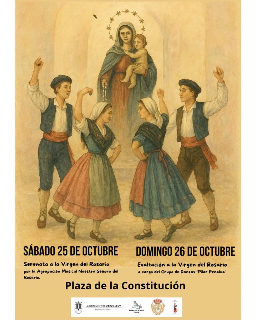 Crevillent – La Concejalía de Cultura ha presentado una nueva iniciativa que formará parte del calendario cultural de este año. Este domingo 26 de octubre, a partir de las 18:30 horas, el grupo de danzas crevillentino “Pilar Penalva” ofrecerá, en la Iglesia de Nuestra Señora de Belén, una exaltación especial en honor a la patrona de Crevillent, la Virgen del Rosario, en un evento que promete llenar de música, color y emoción las calles del municipio.
