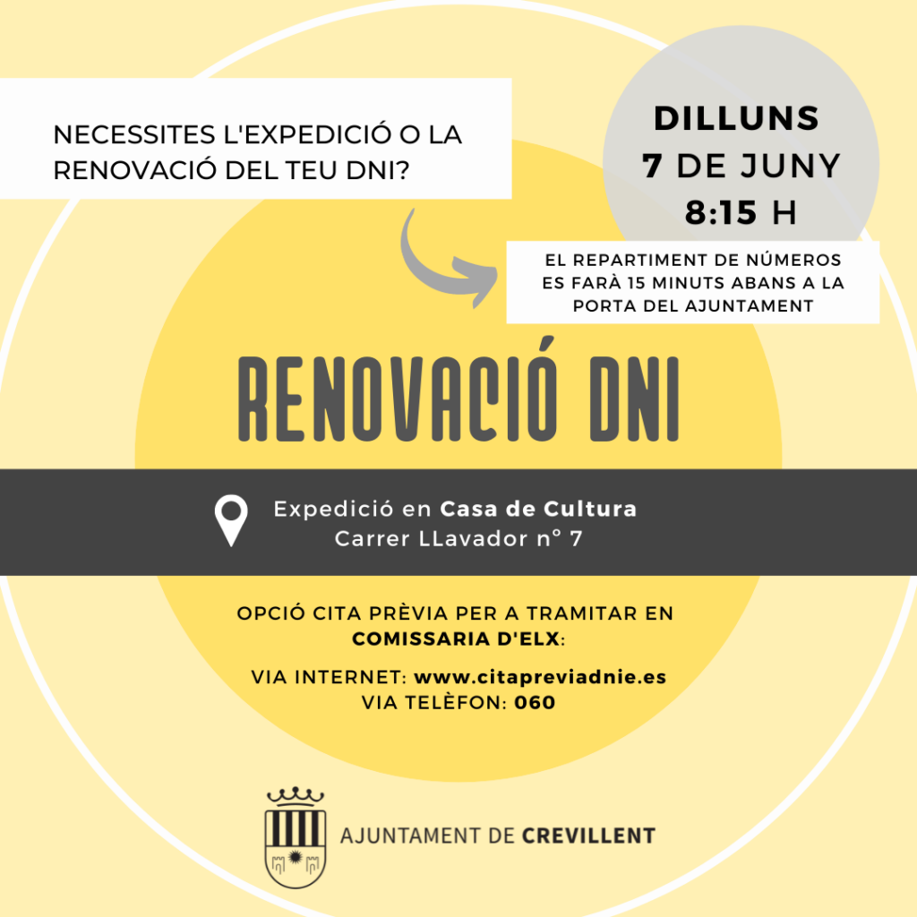 El pròxim repartiment de números per a la tramitació del DNI es realitzarà el dilluns, 7 de juny, a les 8.15 hores a la porta de l’Ajuntament de Crevillent. Seguidament s’iniciarà l’expedició del Document Nacional d’Identitat a la Casa Municipal de Cultura, situada en carrer LLavador núm. 7. Es repartiran un total de 45 números i un únic número per persona.