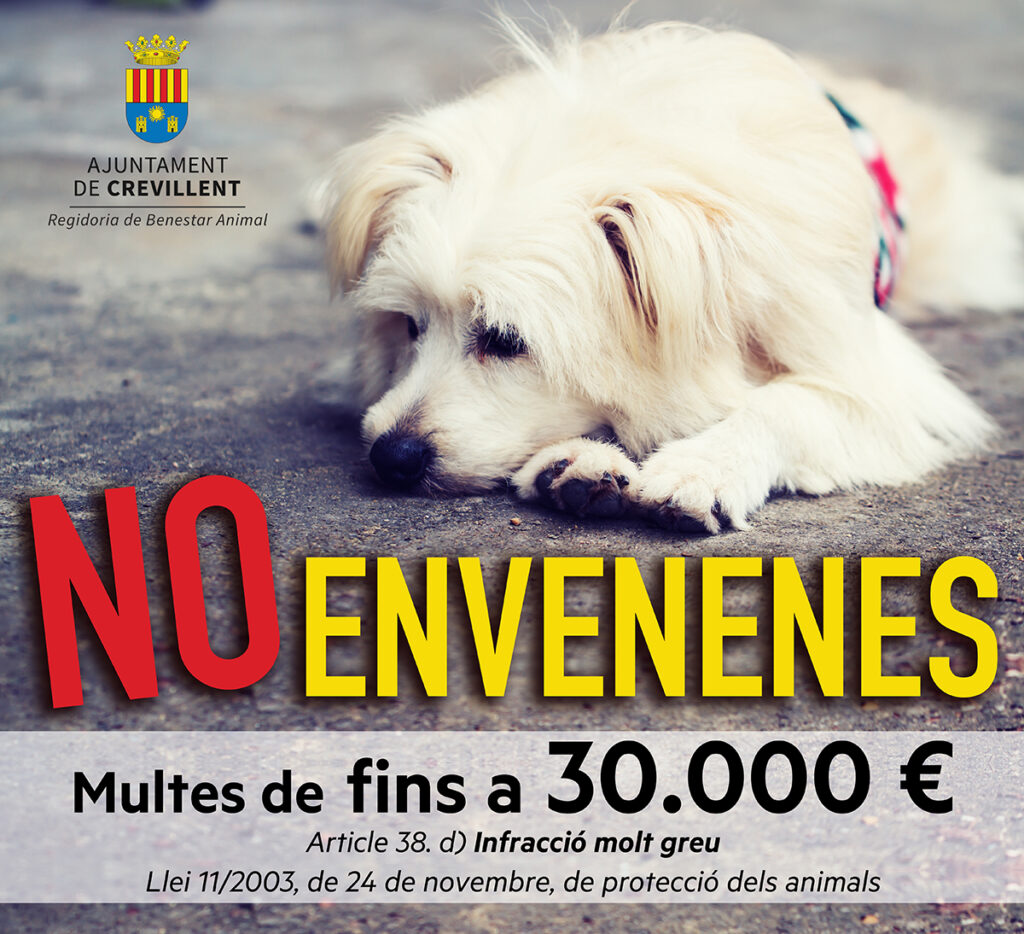 Des de l’Ajuntament s’uneixen a la denúncia de les protectores de Crevillent “Patas Sin Fronteras” i “Pels Pèls” i recorden que enverinar animals està estipulat en la llei estatal com una infracció molt greu (Llei 11/2003, de 24 de novembre, de Protecció dels Animals), i pot comportar multes de fins a 30.000 euros.
