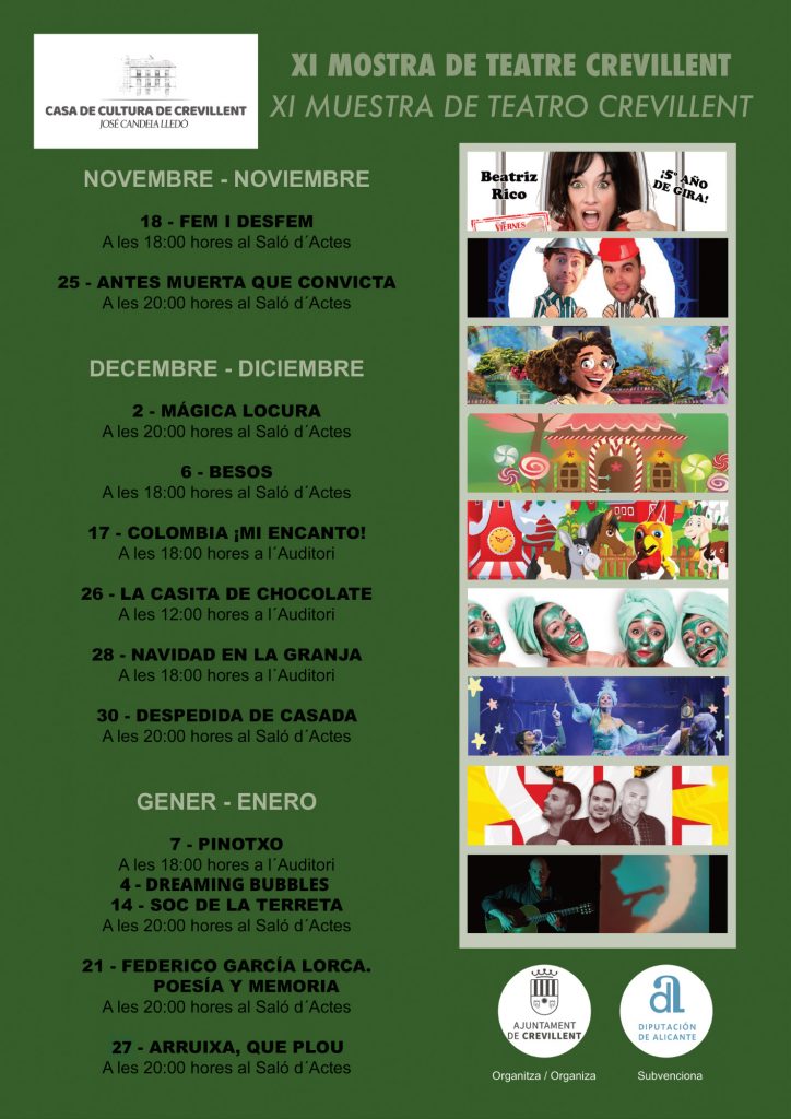 Desde la Concejalía de Cultura del Ayuntamiento de Crevillent, nos invitan a disfrutar de esta programación cultural a través del teatro, con diversidad de géneros y para todos los públicos.