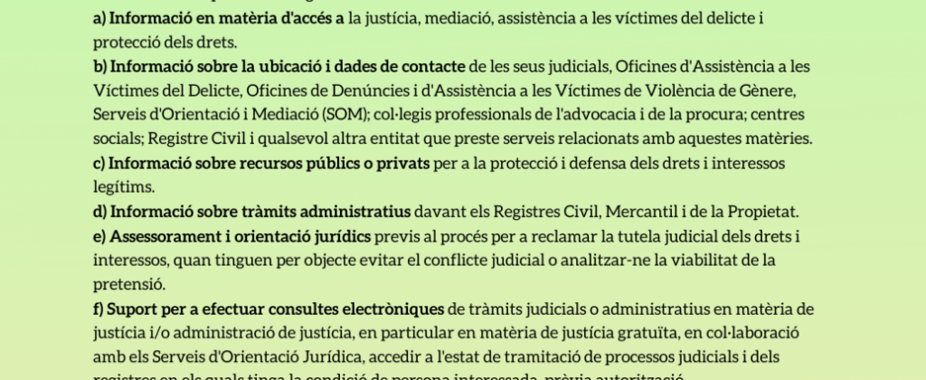 D’entre tots els serveis oferits, Manuel Penalva Alarcón destaca el suport ciutadà per a realitzar consultes sobre tràmits corresponents en matèria de justícia gratuïta. En aquest nou servei s’informarà de tot allò corresponent a aquest tema, així com de la documentació necessària, i en cas necessari, se li demana cita al ciutadà per a personar-se davant del Servei d’Orientació Jurídica situat a la Ciutat de la Justícia d’Elx i iniciar l’expedient.