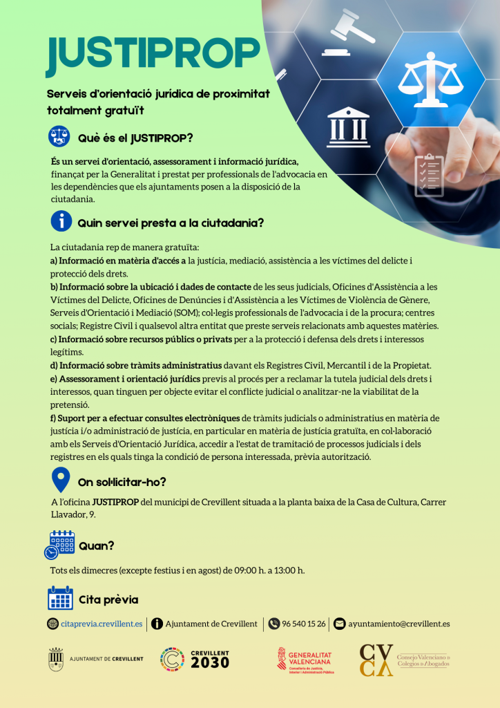 El Ayuntamiento de Crevillent pone al servicio de su ciudadanía “JUSTIPROP”, un nuevo servicio de orientación jurídica gratuito financiado por la Generalitat