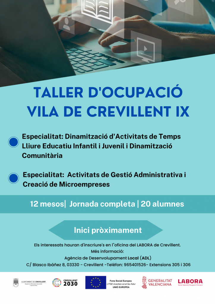 En el projecte anomenat “Taller d’Ocupació Vila de Crevillent IX”, hi haurà un total de 20 participants distribuïts en 2 grups de 10 persones. Les especialitats formatives són “Dinamització d’activitats de temps lliure educatiu infantil i juvenil i Dinamització comunitària” i “Activitats de gestió administrativa i creació i gestió de microempreses”.