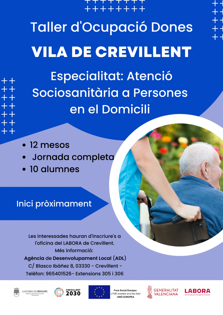 D’altra banda, el “Taller d’Ocupació Dones Vila de Crevillent” s’estrenarà al municipi i comptarà amb un total de 10 places per a l’especialitat formativa d’“Atenció sociosanitària a persones al domicili”, destinades a dones en situació de vulnerabilitat.