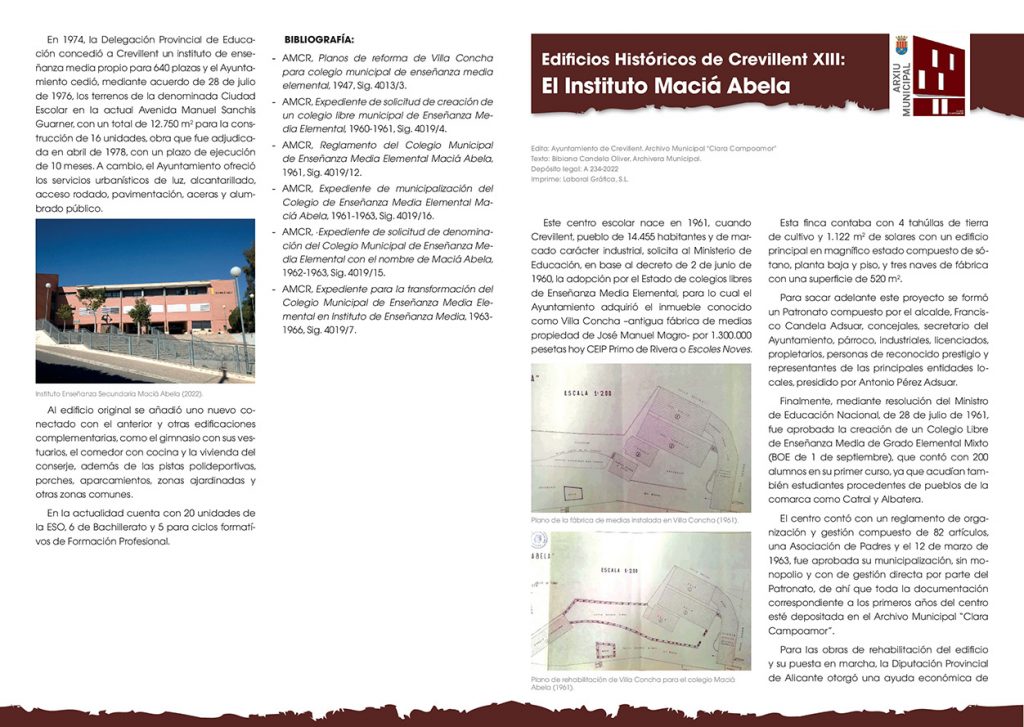 El Archivo Municipal edita el número trece de la serie Edificios Históricos de Crevillent, dedicado a la historia del IES Maciá Abela