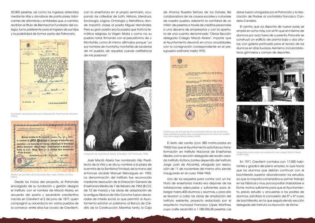En esta publicación y gracias a la gran cantidad de documentación perteneciente a los primeros años del Instituto Maciá Abela, la archivera municipal, Bibiana Candela, ha realizado un recorrido desde su creación, hasta su ubicación actual, haciendo especial incapié en las obras realizadas en el centro original, adquirido por el Ayuntamiento a los herederos de José Manuel Magro, y donde estuvo la famosa fábrica de las medias, todo ello con fotografías inéditas que muestran la adaptación de este recinto para instituto, al que acudían también los jóvenes de localidades cercanas.