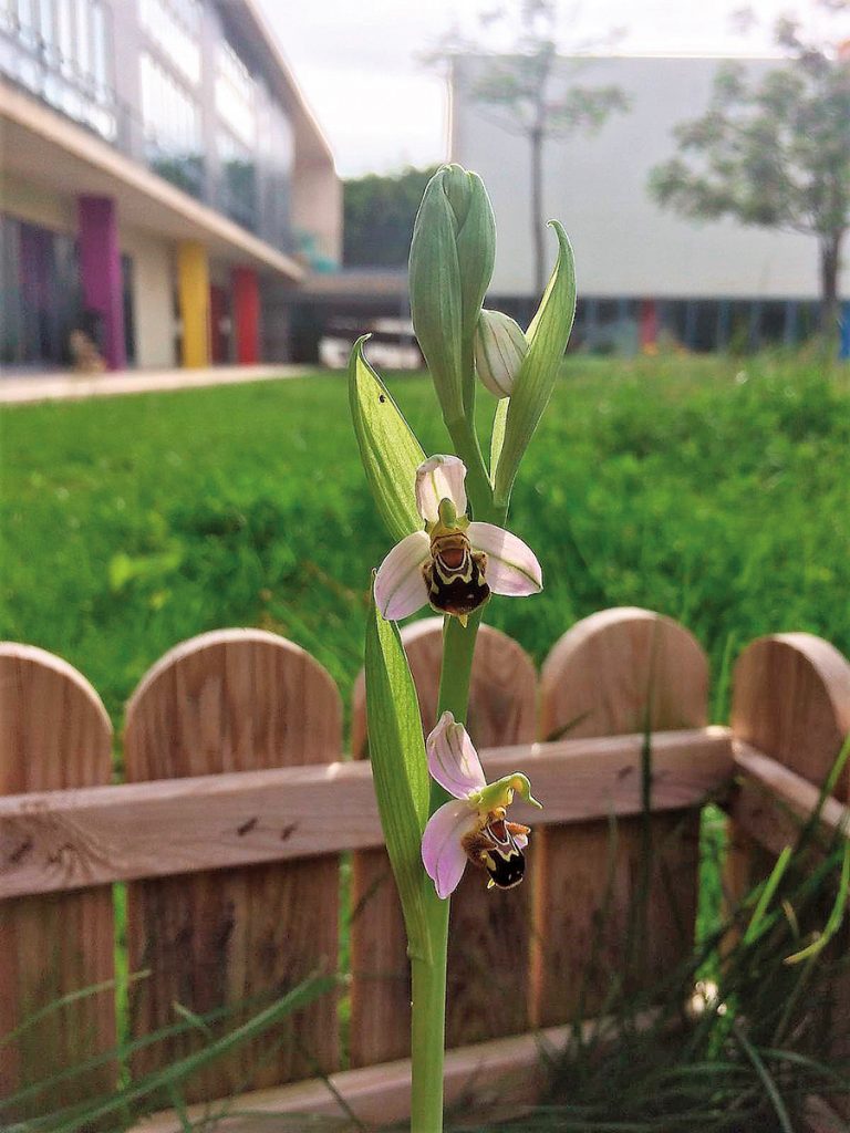 Una de sus últimas heroicidades se ha producido en un colegio infantil de nuestra localidad, el CEIP Julio Quesada- Mestra Pilar Ruiz, al sur de la población. Sorprendentemente, por lo inusual del caso, al amparo del confinamiento germinaron en el patio ajardinado del centro escolar muchas de estas orquídeas autóctonas, en concreto de la especie Ophrys apifera que apenas había sido observada a nivel local. Desde ese momento todo el personal se volcó en su conservación.